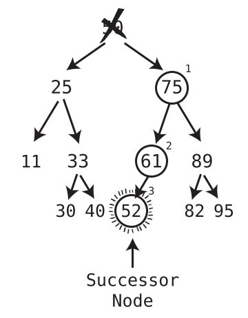 Visit the right child of the deleted value, and then keep on visiting the left child of each subsequent child until there are no more left children. The bottom value is the successor node.